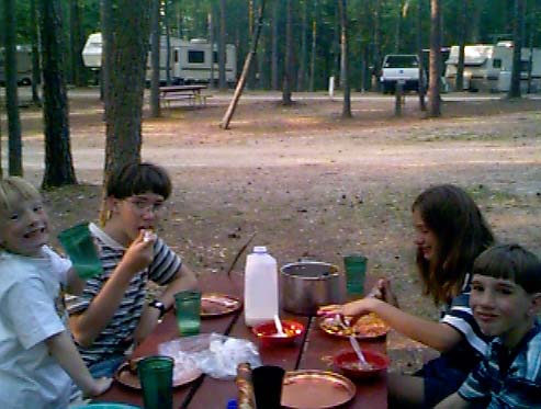 I had noticed yesterday that people seemed to be watching us as we cooked and it just occurred to me today that we hadn't seen anybody else cooking, even the few other folks in tents. While we were fixing dinner tonight, a family pulled in next to us who also had a tent. They set up their tent, then I figured they'd also be cooking, but instead they all piled back into their car and took off, I assume to the McDonald's down the road. Same syndrome with folks not wanting yards or gardens -- they seem to want camping without effort (wasn't there a language learning series called something like "French without Toil"?)