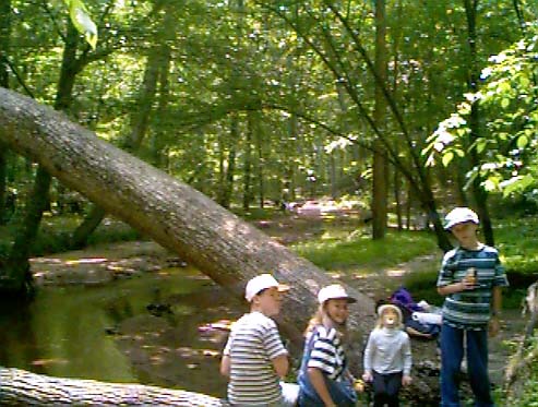 I'm sitting by a bend in the stream along Beaver Lake Trail at Pocohontas State Park. It's a beautiful spot, where there is a magnificent view of the stream bending through the woods, with sand banks on both sides. It's close to the Old Mill site. The kids are having races with toy boats.